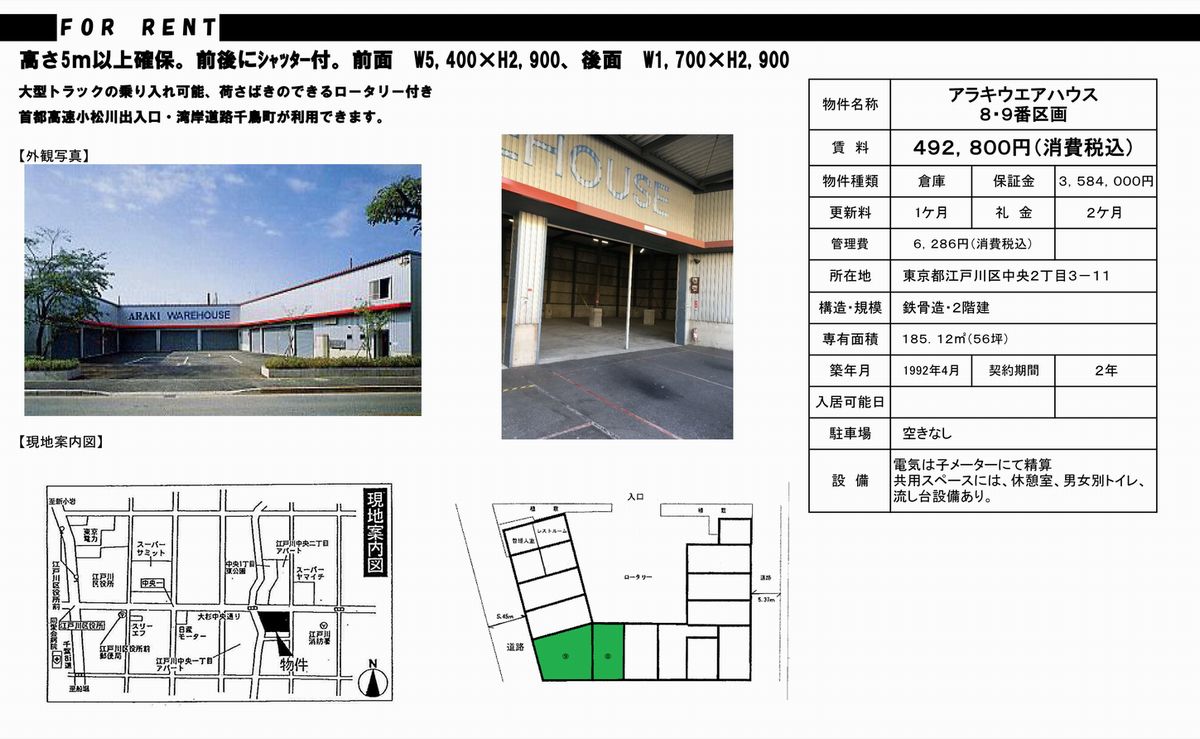 東京都江戸川区中央2-3-11 (新小岩) アラキウェアハウス8・9区画 詳細データ