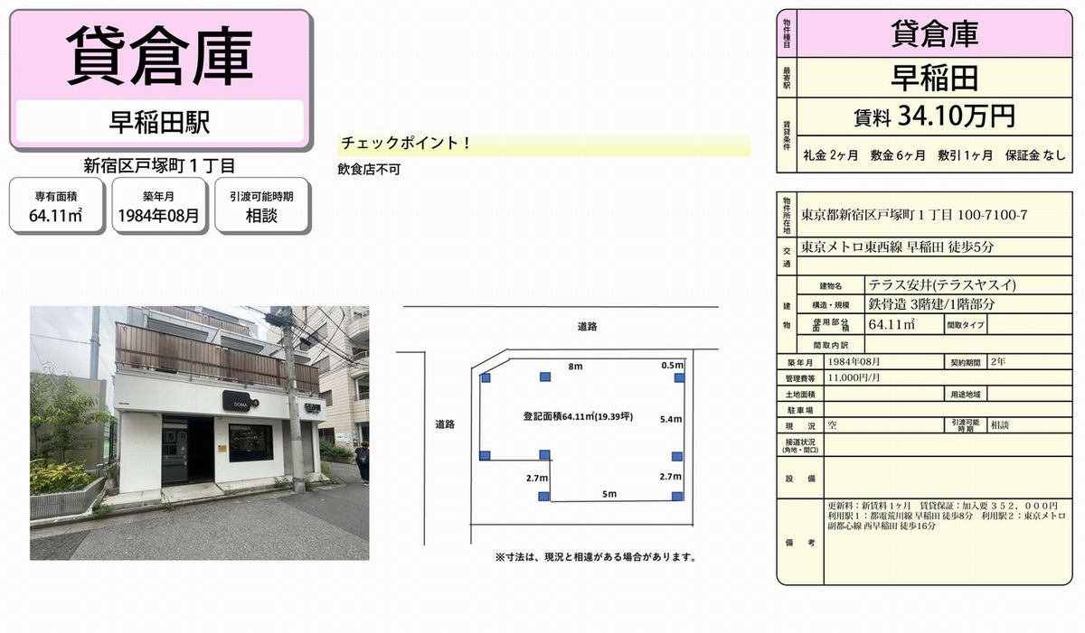 東京都内の貸倉庫・貸工場・賃貸土地の情報満載(トップ) > 東京のエリアで探す > 東京都新宿区 > 早稲田 > 新宿区戸塚町1-100-7 テラス安井