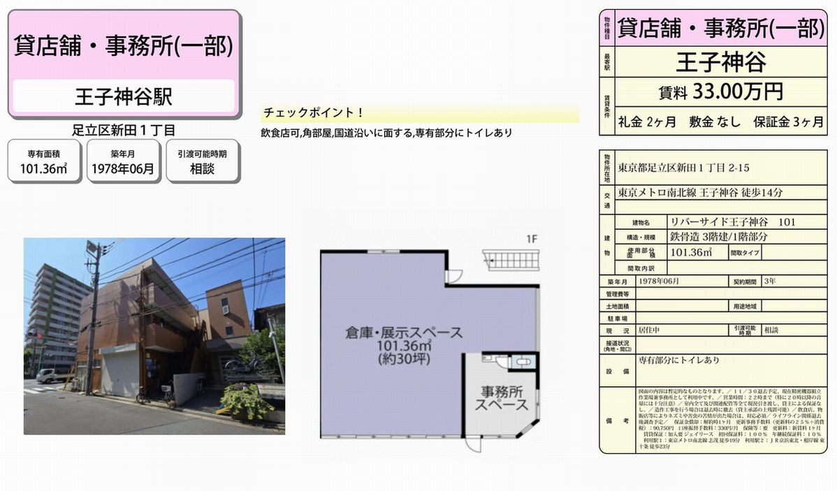 東京都内の貸倉庫・貸工場・賃貸土地の情報満載(トップ) > 東京のエリアで探す > 東京都足立区 > 王子神谷 > 足立区新田1-2-15 リバーサイド王子神谷