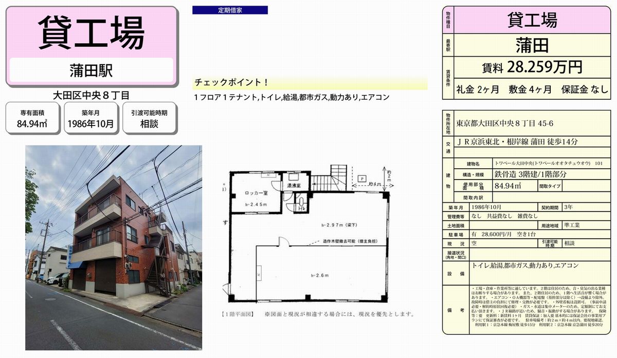 東京都大田区中央8-45-6の貸倉庫・貸工場・賃貸土地を探すなら中小企業を応援する東京貸倉庫.comでニーズに合った物件を検索してください。東京都大田区中央8-45-6の事務所付貸倉庫、クレーン付、店舗倉庫、工業専用地域等、何なりと営業担当者にお申し付けください。その他、東京都大田区中央8-45-6の貸し倉庫・貸し工場・賃貸土地を貸したい方には無料にて査定・掲載いたしますので当社のオーナーサポートシステムをご利用ください。東京都大田区中央8-45-6で貸倉庫・貸工場・賃貸土地を契約のテナント様には貸し倉庫・貸し工場の設計変更、造作のご相談も承ります。貸倉庫・貸工場・賃貸土地の移転・新規開設は東京エリア最大級、新着情報満載、東京貸倉庫.com! |