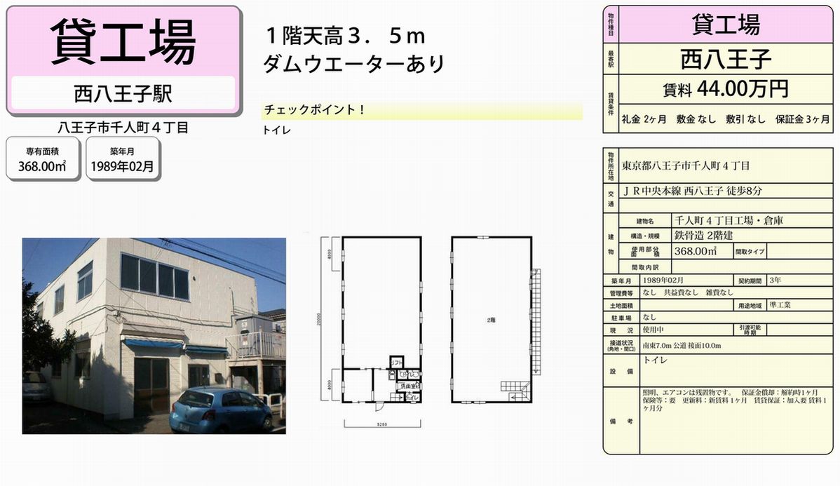 東京都八王子市千人町4-10-2 (西八王子) 西八王子 工場 一棟貸 詳細データ