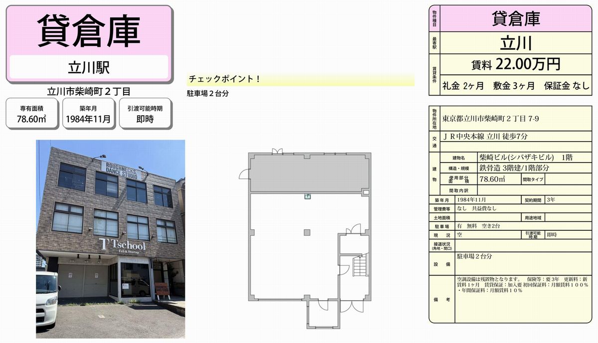 東京都内の貸倉庫・貸工場・賃貸土地の情報満載(トップ) > 東京のエリアで探す > 東京都立川市 > 立川 > 立川市柴崎町2-7-9 柴崎ビル