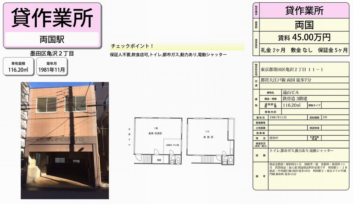 東京都墨田区亀沢2-11-1 (両国) 遠山ビル 詳細データ