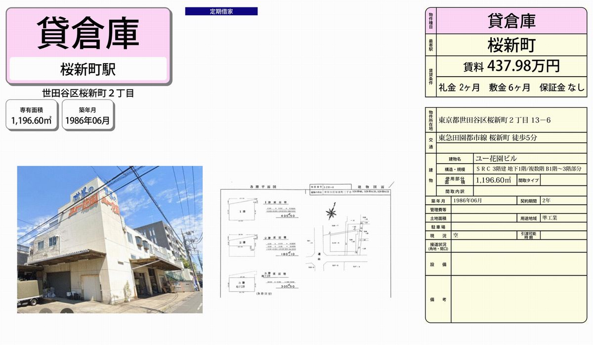 東京都内の貸倉庫・貸工場・賃貸土地の情報満載(トップ) > 東京のエリアで探す > 東京都世田谷区 > 桜新町 > 世田谷区桜新町2-13-6 ユー花園ビル