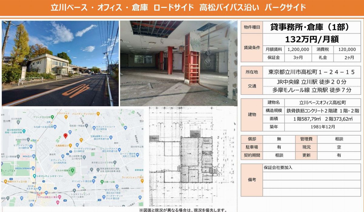 東京都内の貸倉庫・貸工場・賃貸土地の情報満載(トップ) > 東京のエリアで探す > 東京都立川市 > 立川 > 立川市高松町1-24-15 立川 倉庫