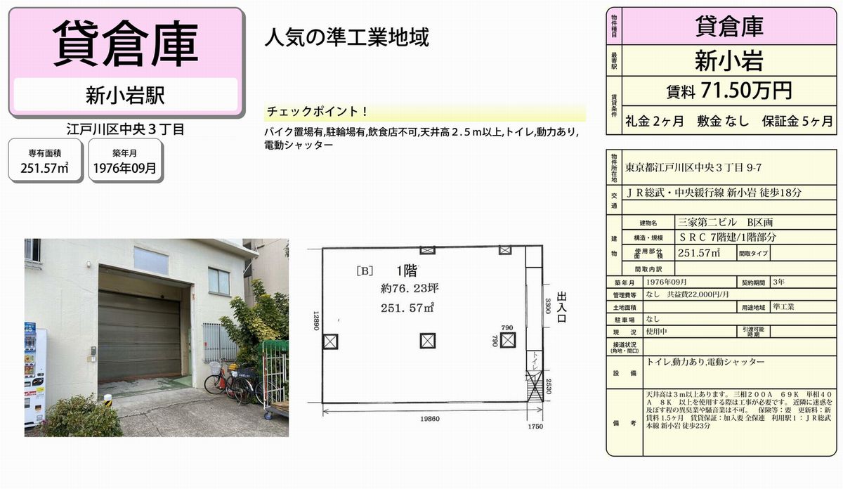 東京都江戸川区中央3-9-7の貸倉庫・貸工場・賃貸土地を探すなら中小企業を応援する東京貸倉庫.comでニーズに合った物件を検索してください。東京都江戸川区中央3-9-7の事務所付貸倉庫、クレーン付、店舗倉庫、工業専用地域等、何なりと営業担当者にお申し付けください。その他、東京都江戸川区中央3-9-7の貸し倉庫・貸し工場・賃貸土地を貸したい方には無料にて査定・掲載いたしますので当社のオーナーサポートシステムをご利用ください。東京都江戸川区中央3-9-7で貸倉庫・貸工場・賃貸土地を契約のテナント様には貸し倉庫・貸し工場の設計変更、造作のご相談も承ります。貸倉庫・貸工場・賃貸土地の移転・新規開設は東京エリア最大級、新着情報満載、東京貸倉庫.com!