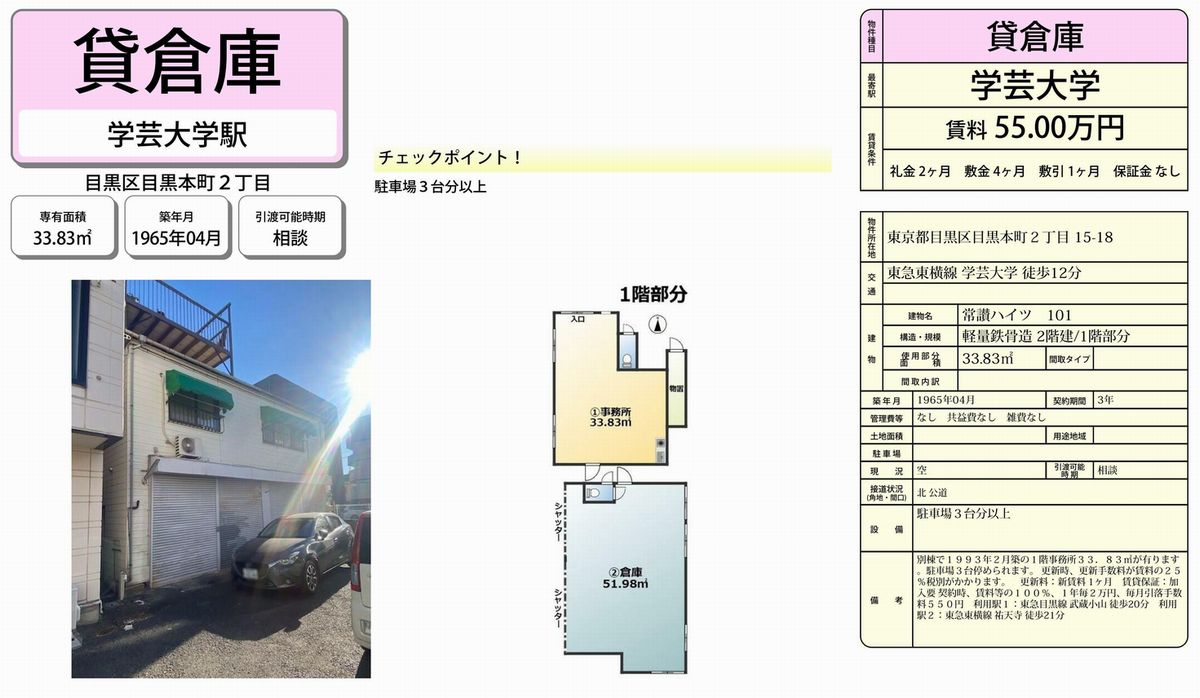 東京都内の貸倉庫・貸工場・賃貸土地の情報満載(トップ) > 東京のエリアで探す > 東京都目黒区 > 学芸大学 > 目黒区目黒本町2-15-18 常讃ハイツ