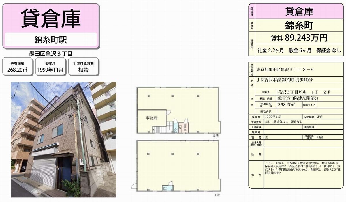東京都墨田区亀沢3-3-6 (錦糸町) 錦糸町 倉庫 詳細データ