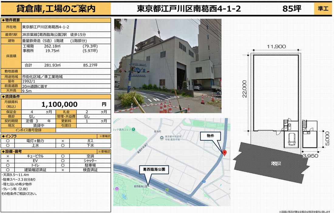 東京都江戸川区南葛西4-1-2の貸倉庫・貸工場・賃貸土地を探すなら中小企業を応援する東京貸倉庫.comでニーズに合った物件を検索してください。東京都江戸川区南葛西4-1-2の事務所付貸倉庫、クレーン付、店舗倉庫、工業専用地域等、何なりと営業担当者にお申し付けください。その他、東京都江戸川区南葛西4-1-2の貸し倉庫・貸し工場・賃貸土地を貸したい方には無料にて査定・掲載いたしますので当社のオーナーサポートシステムをご利用ください。東京都江戸川区南葛西4-1-2で貸倉庫・貸工場・賃貸土地を契約のテナント様には貸し倉庫・貸し工場の設計変更、造作のご相談も承ります。貸倉庫・貸工場・賃貸土地の移転・新規開設は東京エリア最大級、新着情報満載、東京貸倉庫.com! |