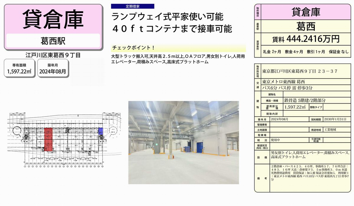 東京都江戸川区東葛西9-23-37の貸倉庫・貸工場・賃貸土地を探すなら中小企業を応援する東京貸倉庫.comでニーズに合った物件を検索してください。東京都江戸川区東葛西9-23-37の事務所付貸倉庫、クレーン付、店舗倉庫、工業専用地域等、何なりと営業担当者にお申し付けください。その他、東京都江戸川区東葛西9-23-37の貸し倉庫・貸し工場・賃貸土地を貸したい方には無料にて査定・掲載いたしますので当社のオーナーサポートシステムをご利用ください。東京都江戸川区東葛西9-23-37で貸倉庫・貸工場・賃貸土地を契約のテナント様には貸し倉庫・貸し工場の設計変更、造作のご相談も承ります。貸倉庫・貸工場・賃貸土地の移転・新規開設は東京エリア最大級、新着情報満載、東京貸倉庫.com! |