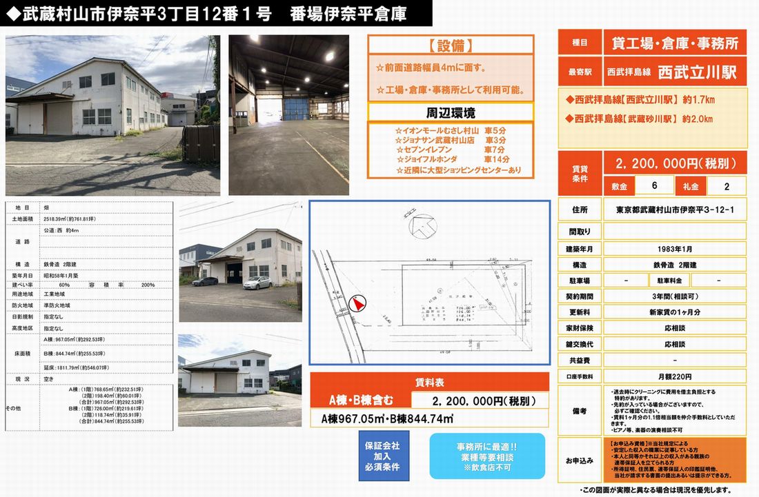 東京都武蔵村山市伊奈平3-12-1の貸倉庫・貸工場・賃貸土地を探すなら中小企業を応援する東京貸倉庫.comでニーズに合った物件を検索してください。東京都武蔵村山市伊奈平3-12-1の事務所付貸倉庫、クレーン付、店舗倉庫、工業専用地域等、何なりと営業担当者にお申し付けください。その他、東京都武蔵村山市伊奈平3-12-1の貸し倉庫・貸し工場・賃貸土地を貸したい方には無料にて査定・掲載いたしますので当社のオーナーサポートシステムをご利用ください。東京都武蔵村山市伊奈平3-12-1で貸倉庫・貸工場・賃貸土地を契約のテナント様には貸し倉庫・貸し工場の設計変更、造作のご相談も承ります。貸倉庫・貸工場・賃貸土地の移転・新規開設は東京エリア最大級、新着情報満載、東京貸倉庫.com! |