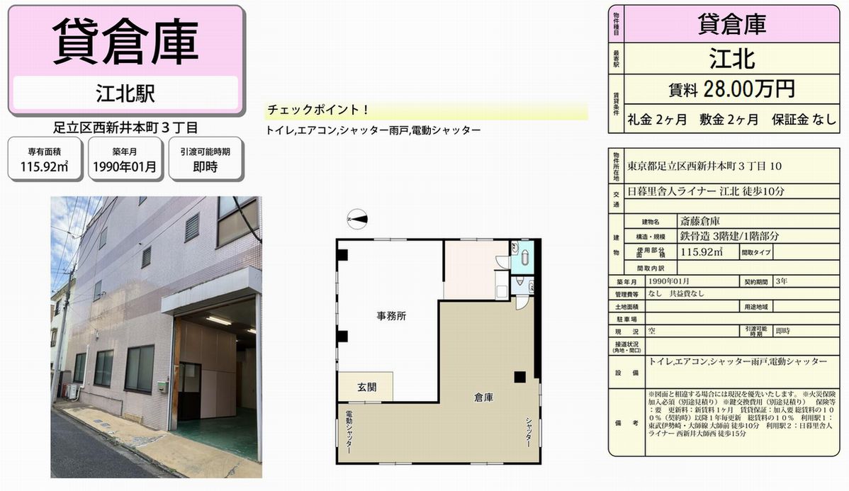 東京都足立区西新井本町3-10の貸倉庫・貸工場・賃貸土地を探すなら中小企業を応援する東京貸倉庫.comでニーズに合った物件を検索してください。東京都足立区西新井本町3-10の事務所付貸倉庫、クレーン付、店舗倉庫、工業専用地域等、何なりと営業担当者にお申し付けください。その他、東京都足立区西新井本町3-10の貸し倉庫・貸し工場・賃貸土地を貸したい方には無料にて査定・掲載いたしますので当社のオーナーサポートシステムをご利用ください。東京都足立区西新井本町3-10で貸倉庫・貸工場・賃貸土地を契約のテナント様には貸し倉庫・貸し工場の設計変更、造作のご相談も承ります。貸倉庫・貸工場・賃貸土地の移転・新規開設は東京エリア最大級、新着情報満載、東京貸倉庫.com!
