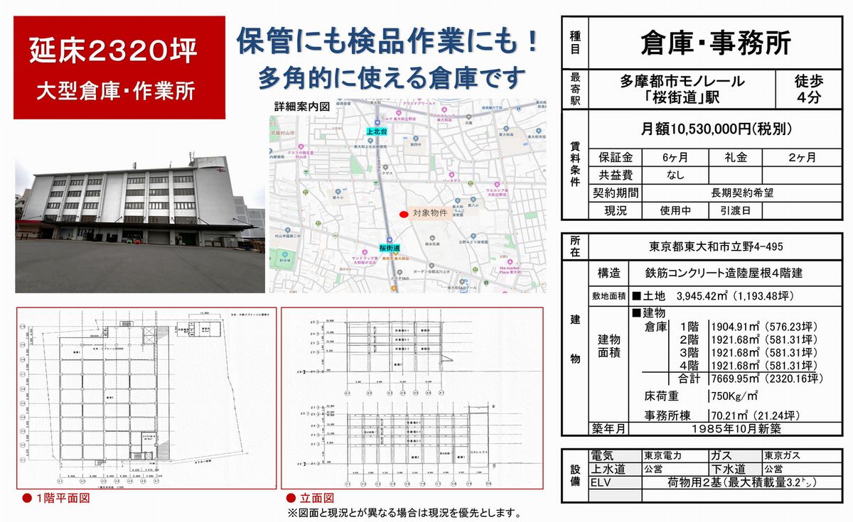 東京都東大和市立野4-495の貸倉庫・貸工場・賃貸土地を探すなら中小企業を応援する東京貸倉庫.comでニーズに合った物件を検索してください。東京都東大和市立野4-495の事務所付貸倉庫、クレーン付、店舗倉庫、工業専用地域等、何なりと営業担当者にお申し付けください。その他、東京都東大和市立野4-495の貸し倉庫・貸し工場・賃貸土地を貸したい方には無料にて査定・掲載いたしますので当社のオーナーサポートシステムをご利用ください。東京都東大和市立野4-495で貸倉庫・貸工場・賃貸土地を契約のテナント様には貸し倉庫・貸し工場の設計変更、造作のご相談も承ります。貸倉庫・貸工場・賃貸土地の移転・新規開設は東京エリア最大級、新着情報満載、東京貸倉庫.com!