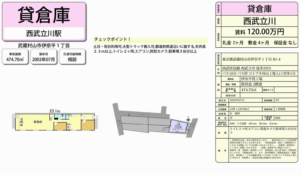 東京都武蔵村山市伊奈平1-81-4 (西武立川) 伊奈平貸工場 詳細データ