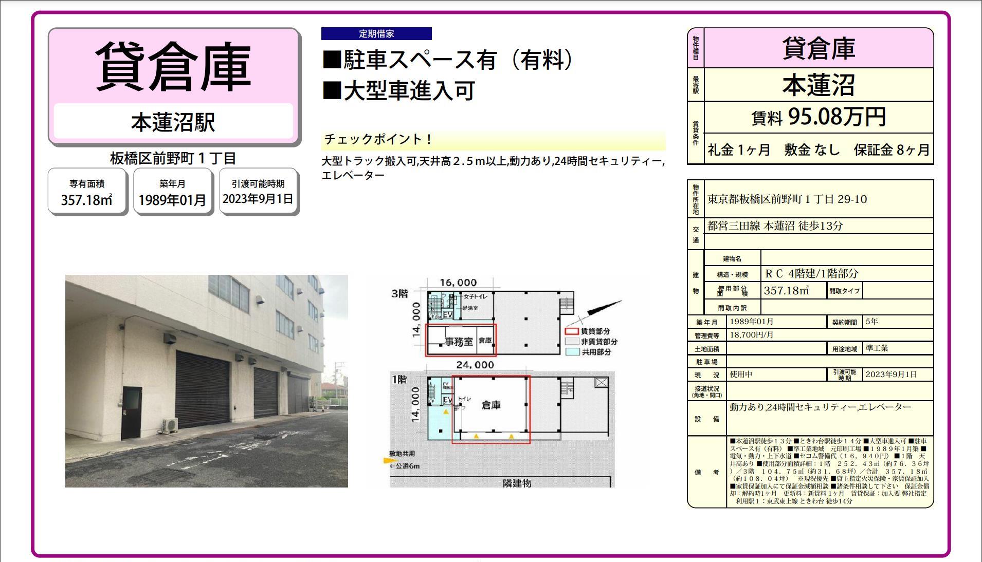 | 備考 | 動力あり24時間セキュリティーエレベーター ■本蓮沼駅徒歩13分■ときわ台駅徒歩14分■大型車進入可■駐車スペース有(有料)■準工業地域元印刷工場■1989年1月築■電気・動力・上下水道■セコム警備代(16,940円)■1階天井高あり■使用部分面積詳細:1階252.43u(約76.36坪)/3階104.75u(約31.68坪)/合計357.18u(約108.04坪)※現況優先■貸主指定火災保険・家賃保証加入■家賃保証加入にて保証金減額相談■諸条件相談して下さい |