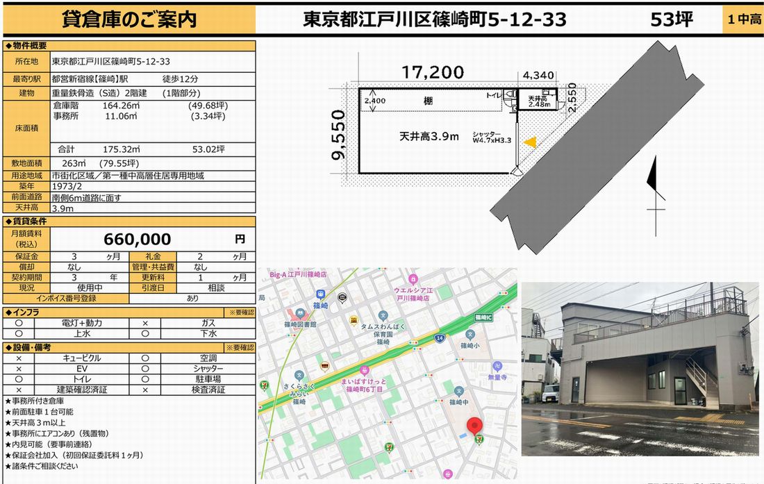 東京都江戸川区篠崎町5-12-33の貸倉庫・貸工場・賃貸土地を探すなら中小企業を応援する東京貸倉庫.comでニーズに合った物件を検索してください。東京都江戸川区篠崎町5-12-33の事務所付貸倉庫、クレーン付、店舗倉庫、工業専用地域等、何なりと営業担当者にお申し付けください。その他、東京都江戸川区篠崎町5-12-33の貸し倉庫・貸し工場・賃貸土地を貸したい方には無料にて査定・掲載いたしますので当社のオーナーサポートシステムをご利用ください。東京都江戸川区篠崎町5-12-33で貸倉庫・貸工場・賃貸土地を契約のテナント様には貸し倉庫・貸し工場の設計変更、造作のご相談も承ります。貸倉庫・貸工場・賃貸土地の移転・新規開設は東京エリア最大級、新着情報満載、東京貸倉庫.com!