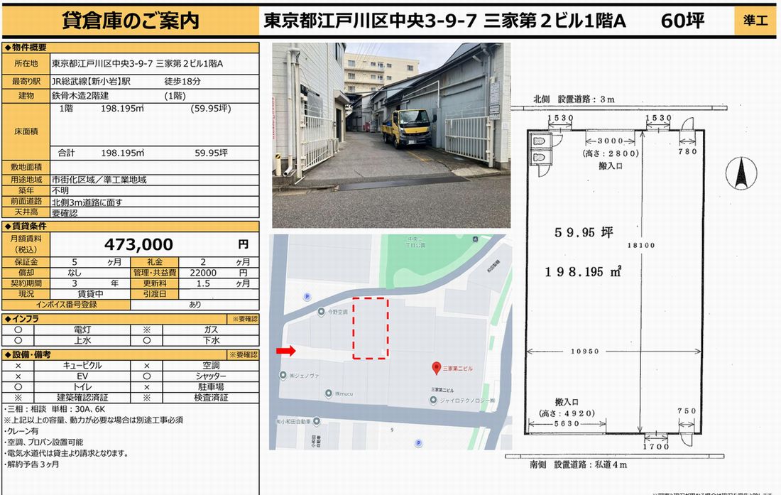東京都内の貸倉庫・貸工場・賃貸土地の情報満載(トップ) > 東京のエリアで探す > 東京都江戸川区 > 新小岩 > 江戸川区中央3-9-7 三家第2ビル