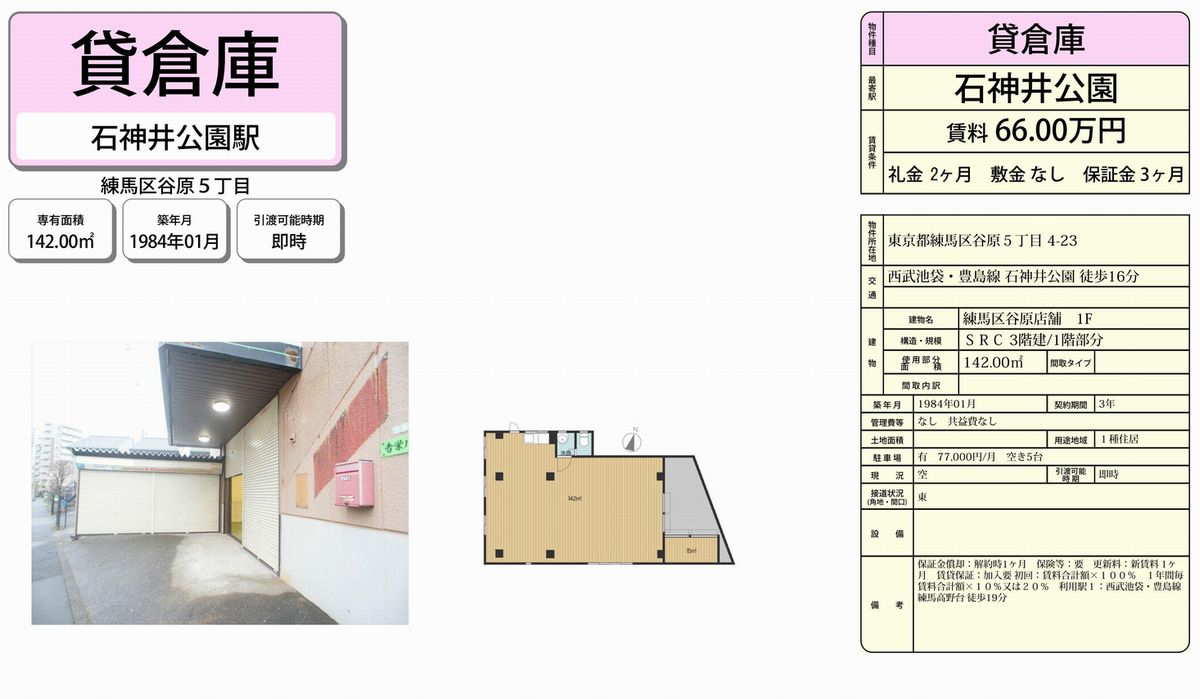 東京都練馬区谷原5-4-23 (石神井公園) 石神井公園 倉庫 詳細データ